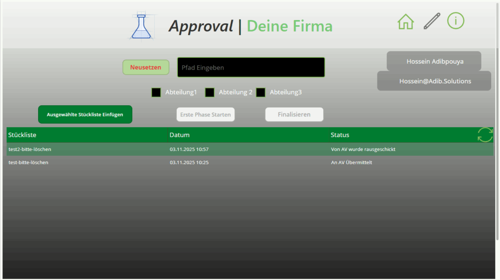 Diese Anwendung wurde entwickelt, um mehrstufige Freigabeprozesse zwischen Abteilungen vollständig zu automatisieren. Über eine zentrale Oberfläche können Stücklisten oder Dateien an mehrere Personen oder Teams gesendet werden – entweder parallel oder sequenziell, je nach Prozessanforderung.
